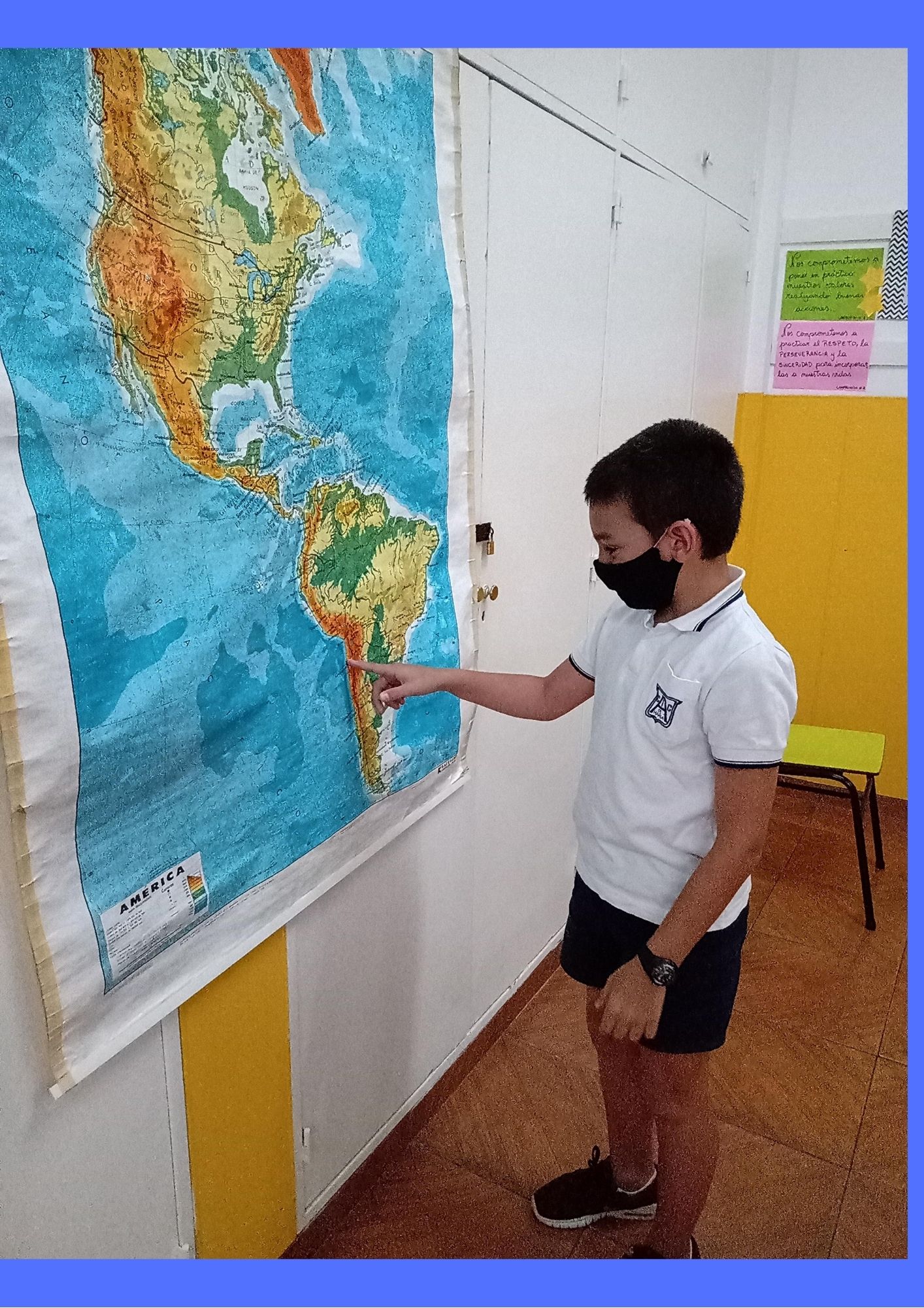 Los chicos de 6to grado juegan a sacar cartelitos con países y capitales americanas dentro de una bolsa para ubicarlas en el mapa.